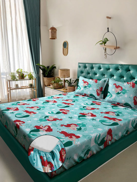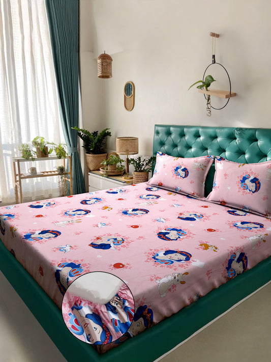Klotthe Multi Cartoon Print 300 TC Cotton Blend Elasticated Double Bedsheet with 2 Pillow Cover in Book Fold Pack
