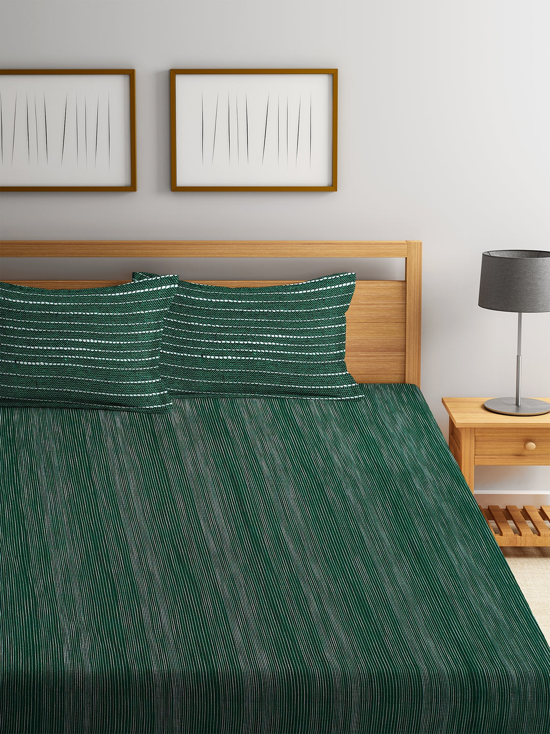 Set Content-KLOTTHE Set of Two Green Cotton Woven Design Double King Bed Covers With 4 Pillow Covers (225X260 cm)
