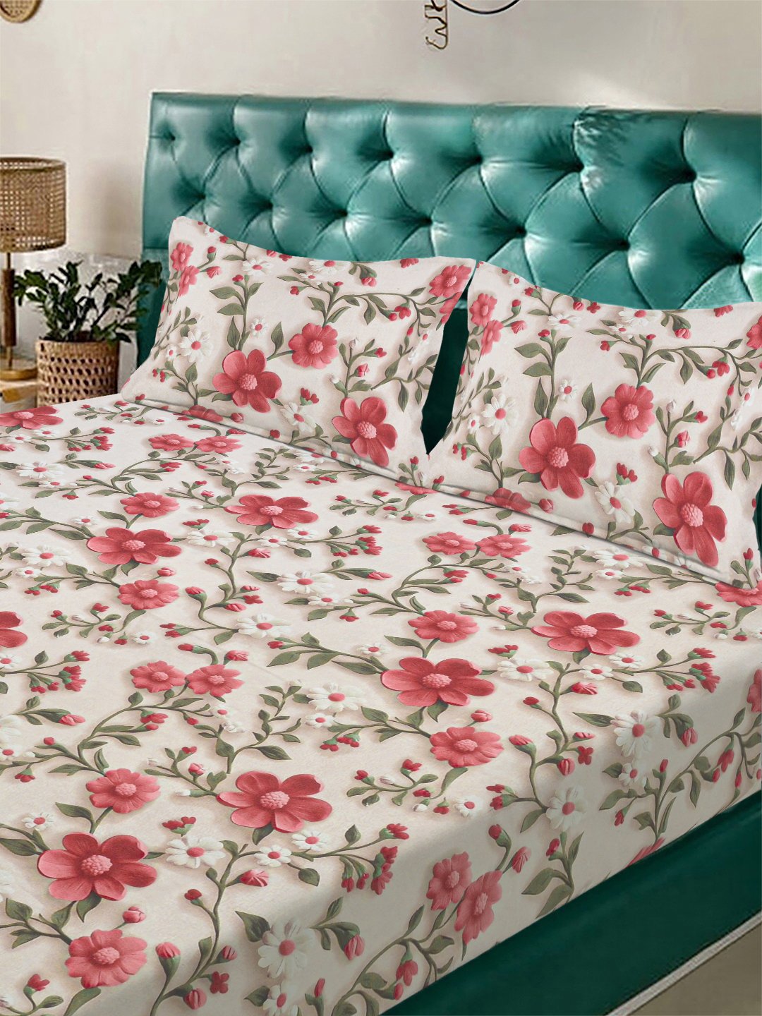Cream Floral 7D King Size Cotton Blend Double Bedsheet with 2 Pillow Covers
