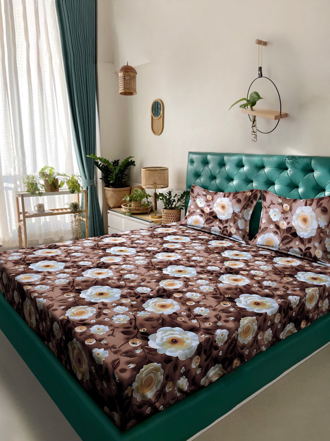 Brown Floral 7D King Size Cotton Blend Double Bedsheet with 2 Pillow Covers