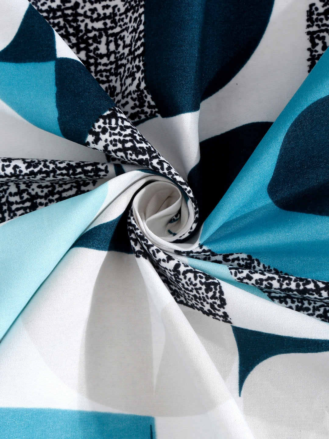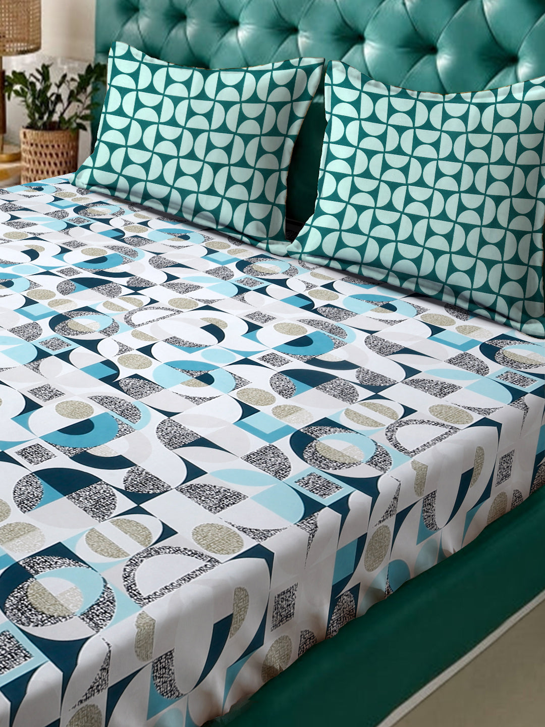 Klotthe White Geometric 300 TC Cotton Blend Fitted Double Bedsheet with 2 Pillow Covers