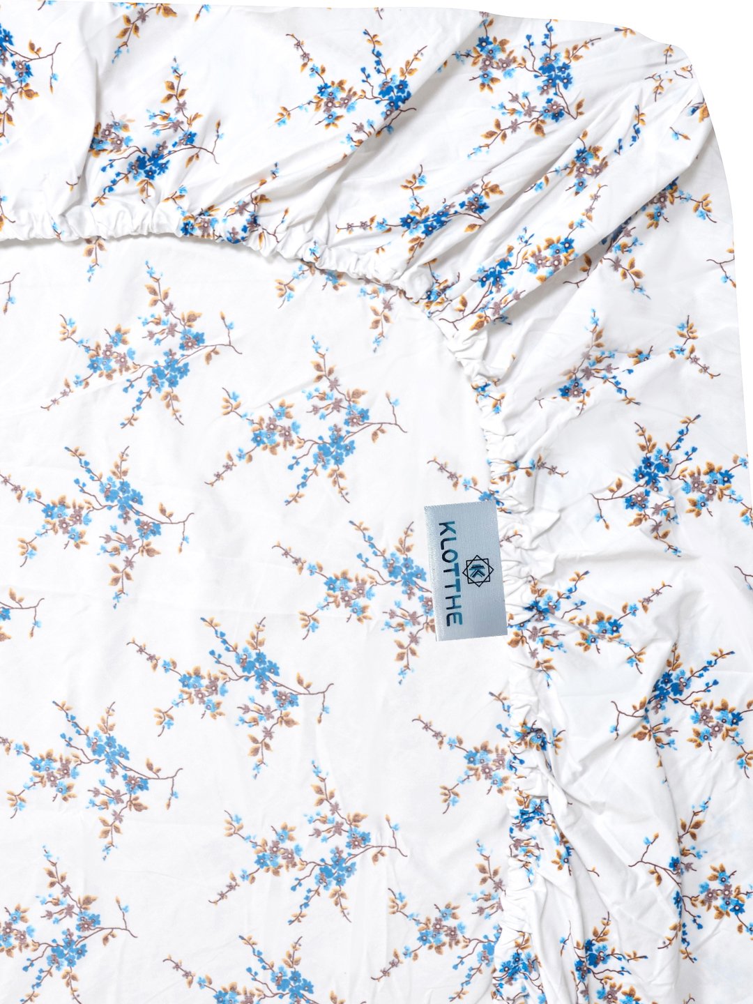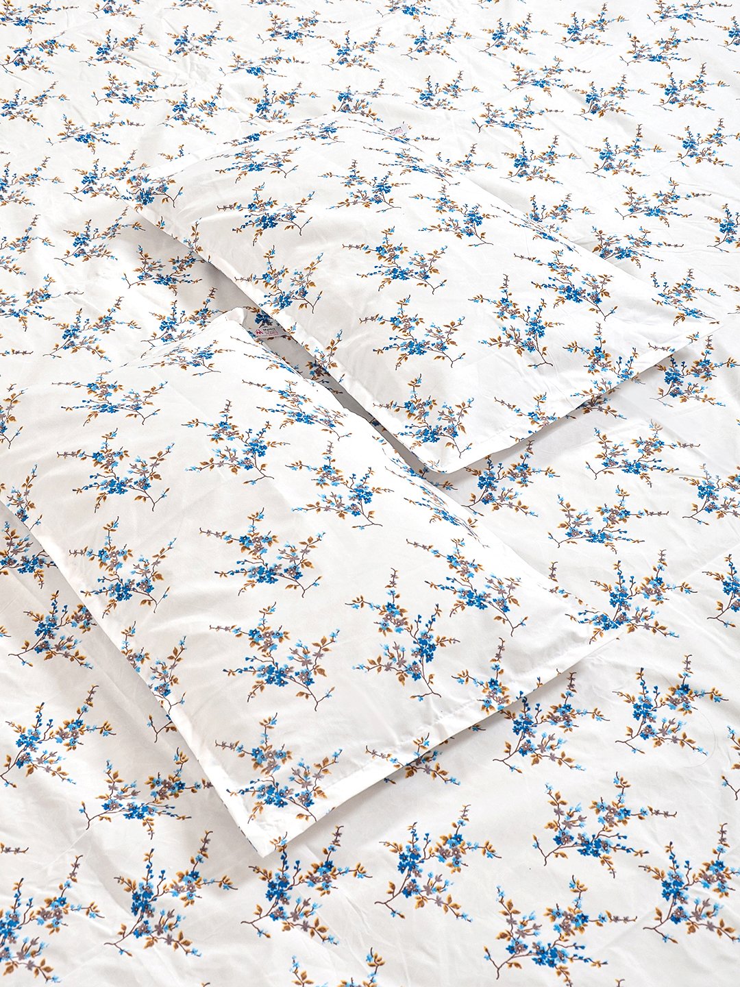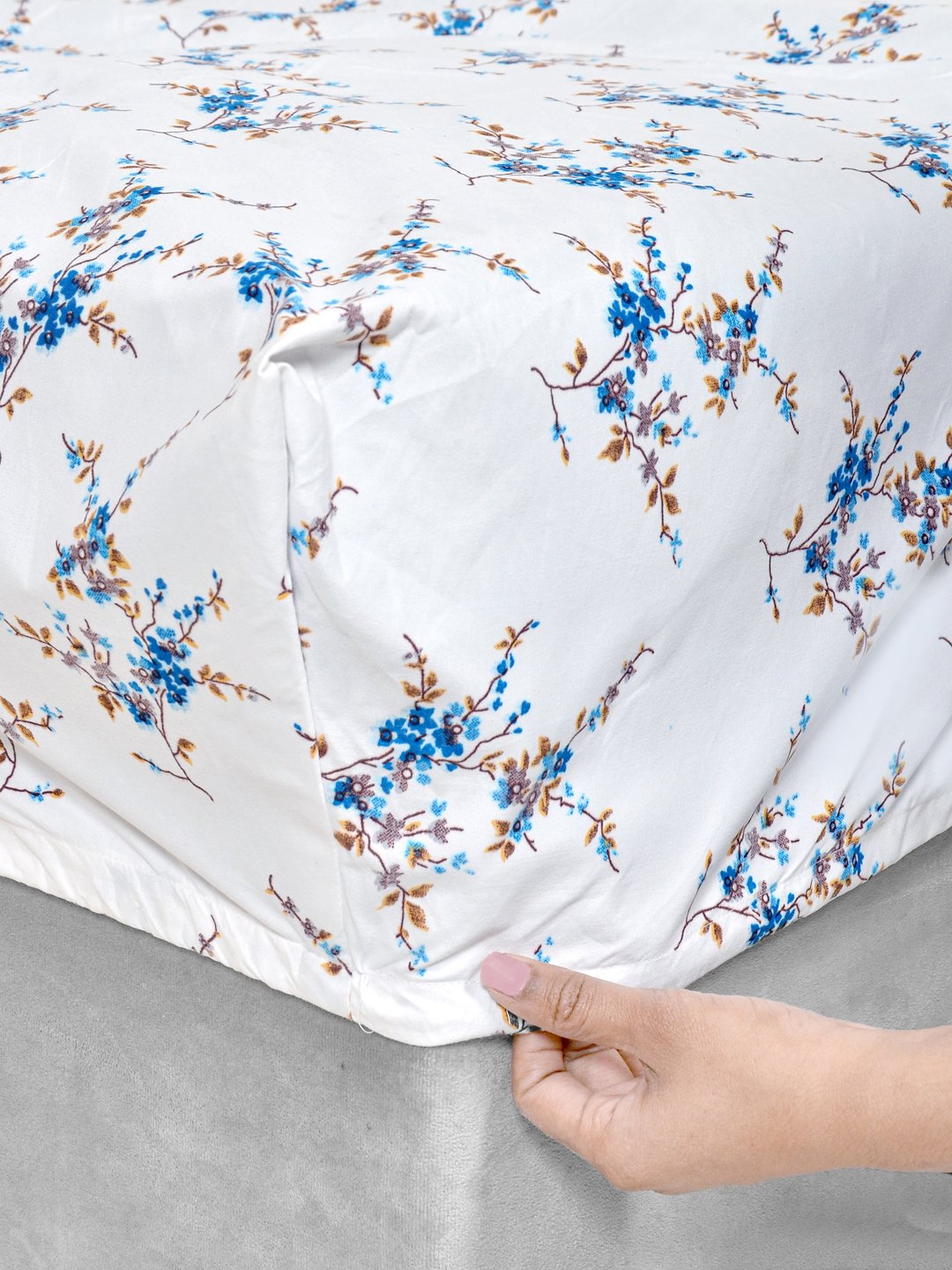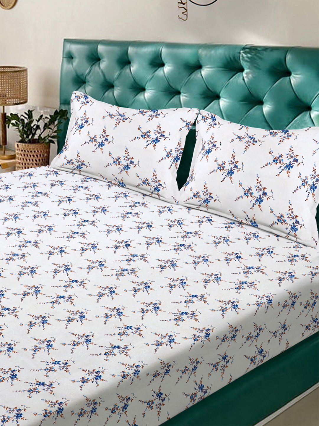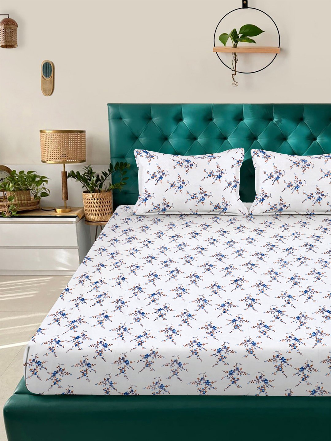 Set Content- White Floral 300 TC Cotton Blend Fitted Double Bedsheet with 2 Pillow Covers