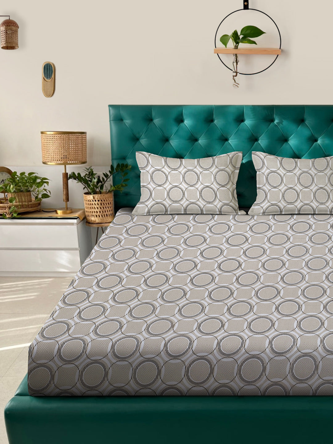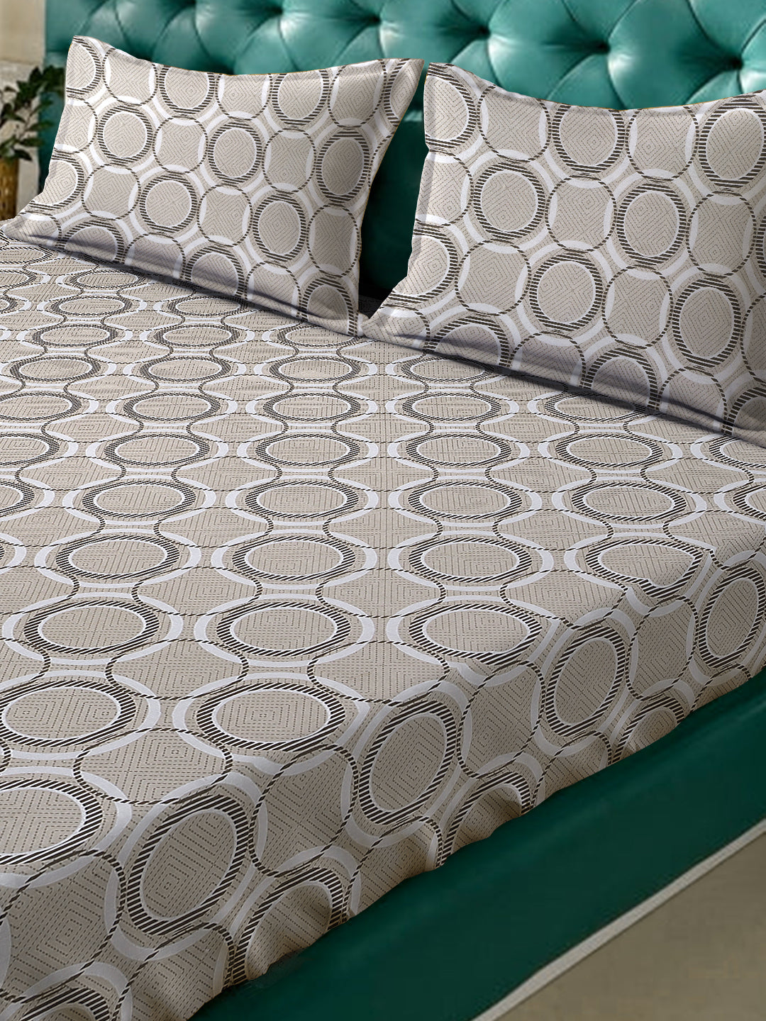Klotthe Beige Geometric 400 TC Pure Cotton Fitted Double Bedsheet with 2 Pillow Covers