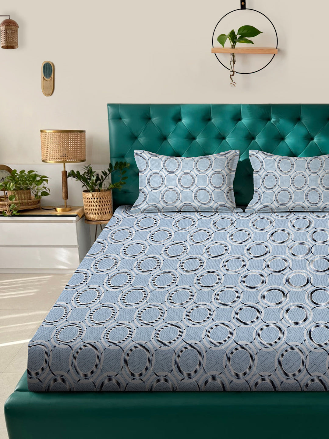 Klotthe Blue Geometric 400 TC Pure Cotton Fitted Double Bedsheet with 2 Pillow Covers