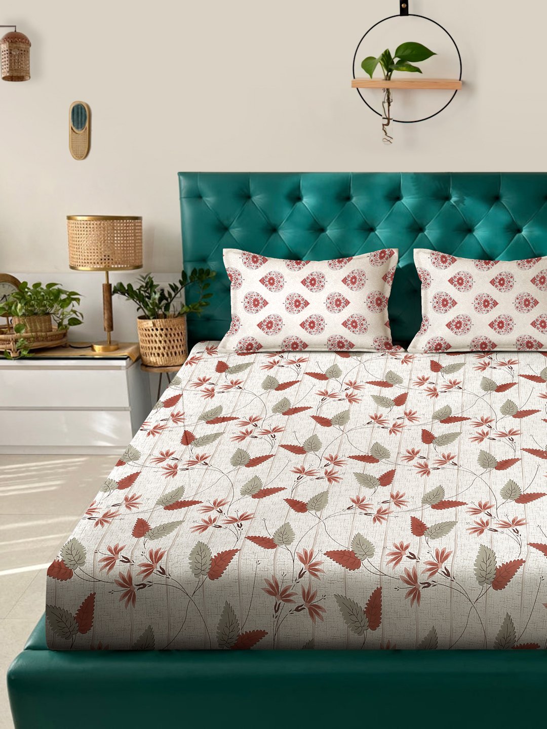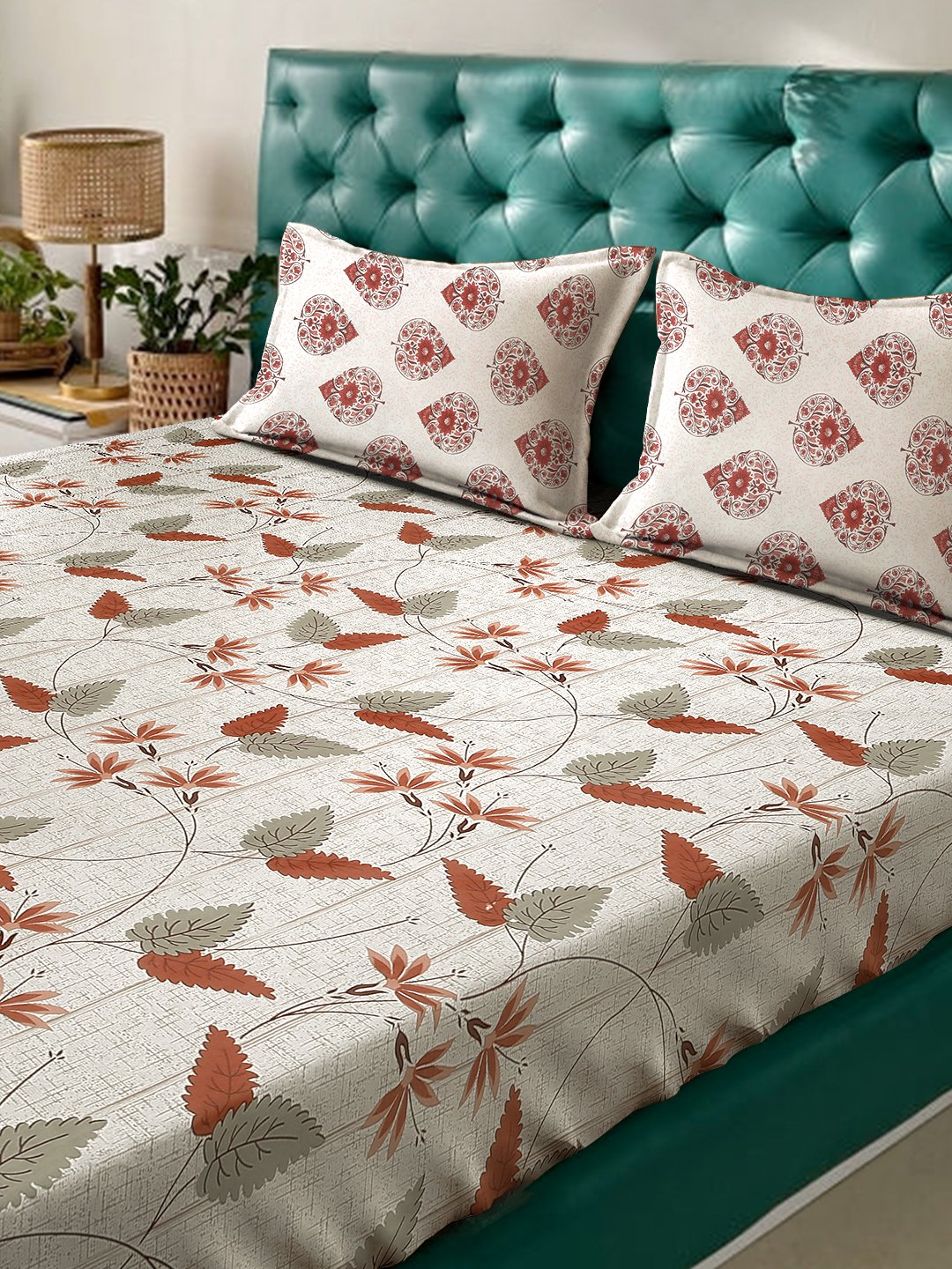 Set Content- Klotthe Beige Floral 400 TC Pure Cotton Fitted Double Bedsheet with 2 Pillow Covers