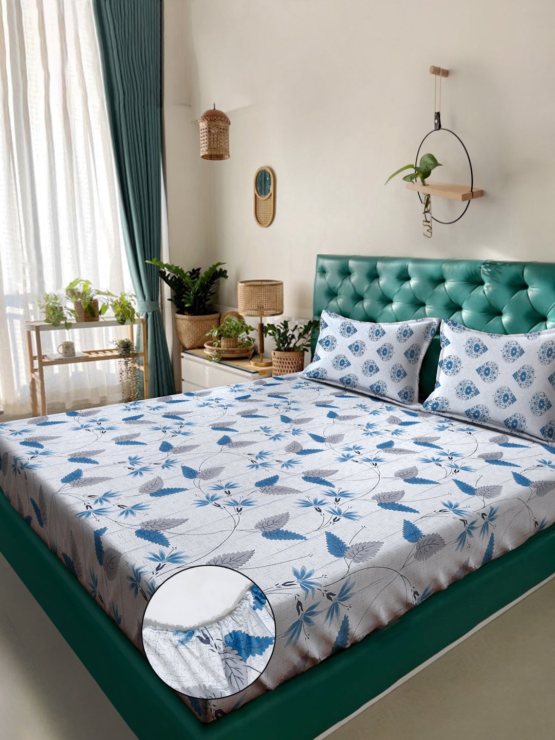 Blue Floral 400 TC Pure Cotton Fitted Double Bedsheet with 2 Pillow Covers