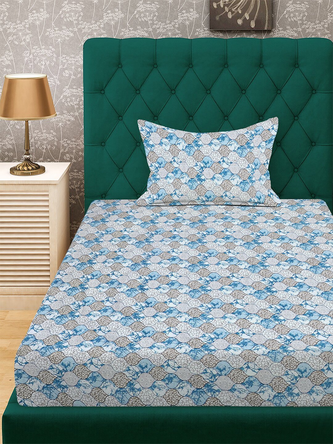 Set Content- Blue Floral 300 TC Cotton Blend Single Bedsheet with 2 Pillow Covers