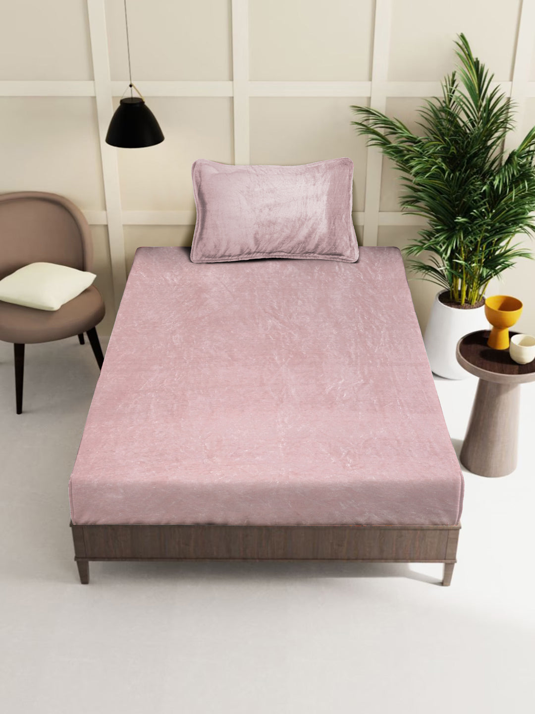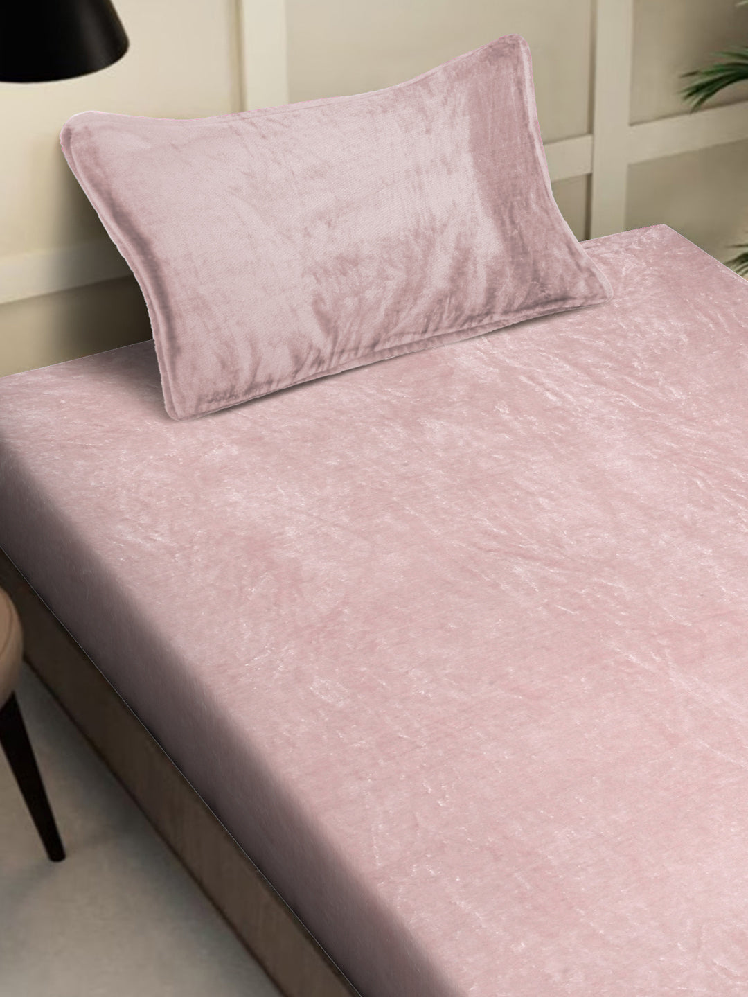 Set Content-Klotthe Light Pink Solid Woolen Fitted Single Bed Sheet with Pillow Cover