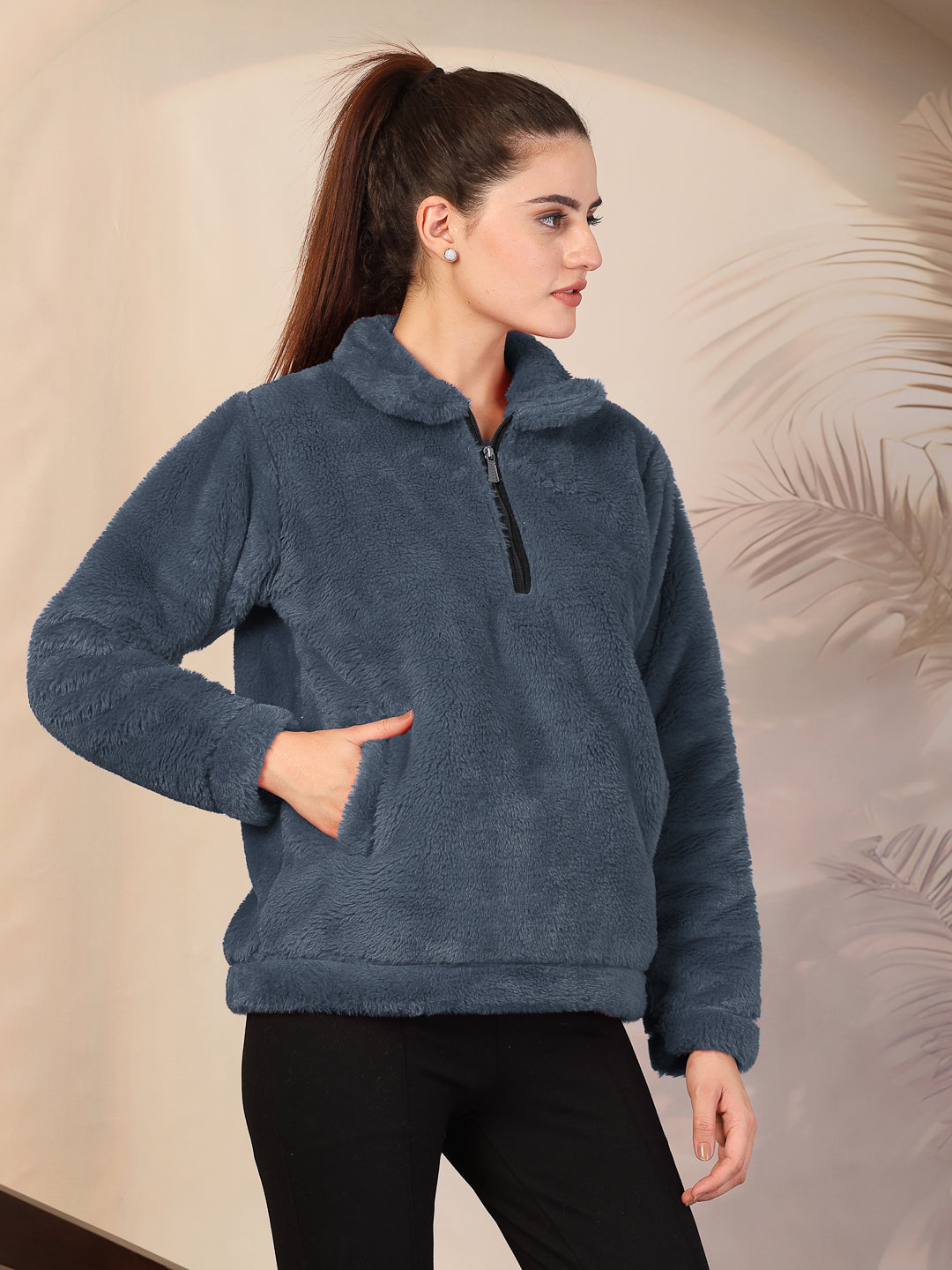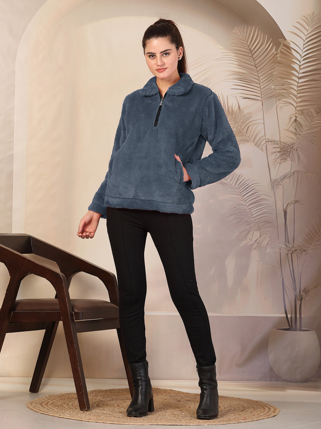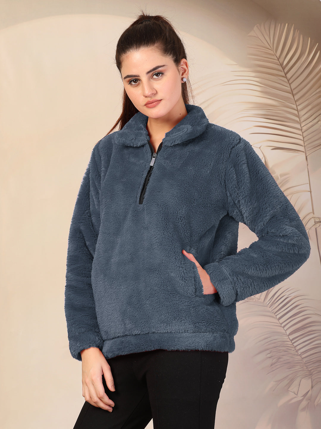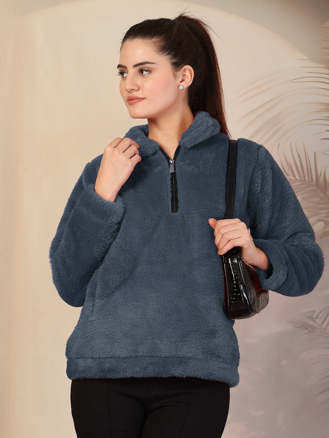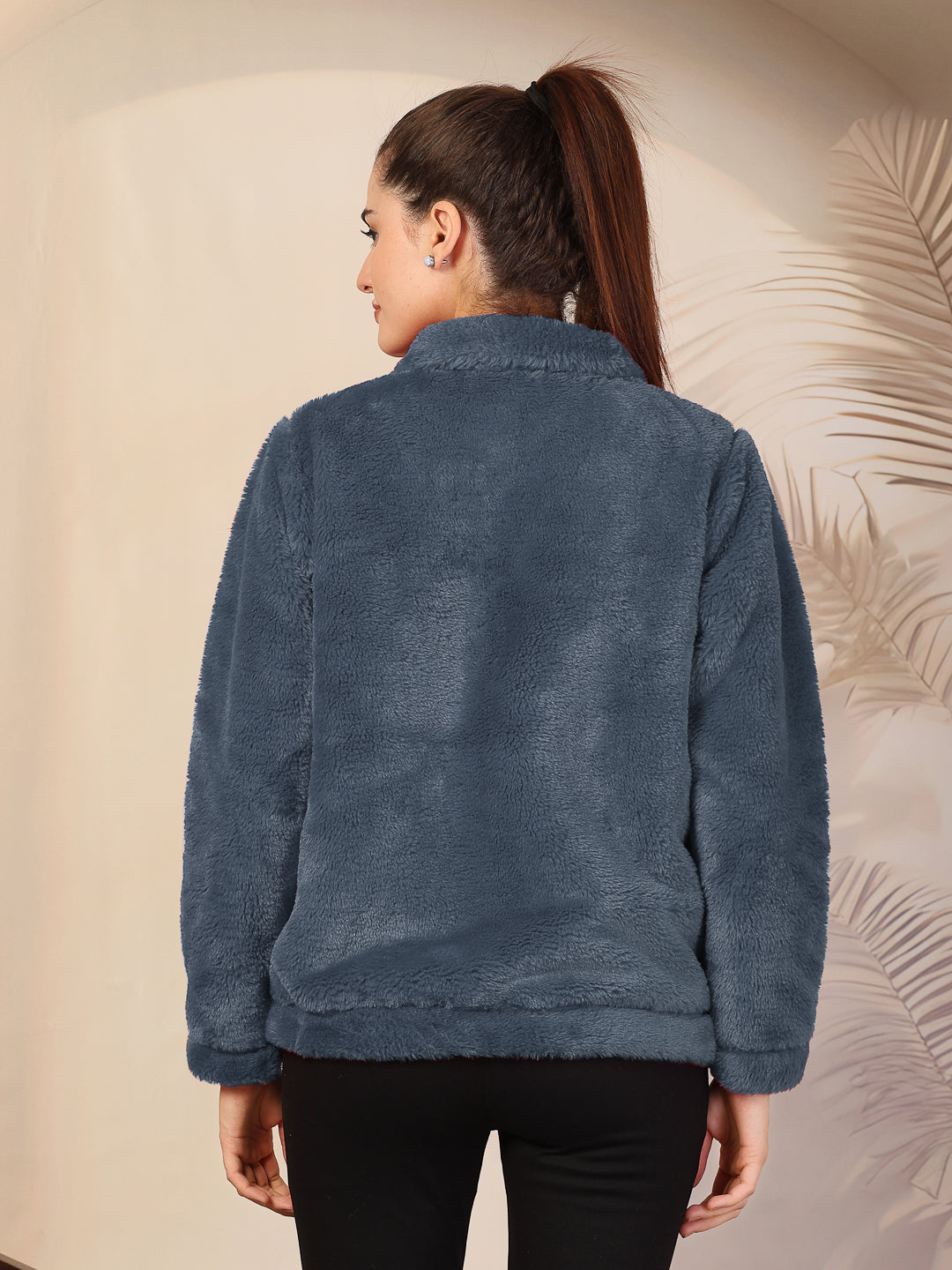 Set Content-Klotthe Women DarkGrey Solid Woolen Fur Winter Jacket