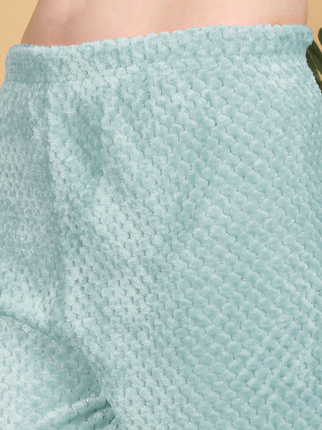 Set Content-Klotthe Women Turquoise Solid Hooded Woolen Night Suit