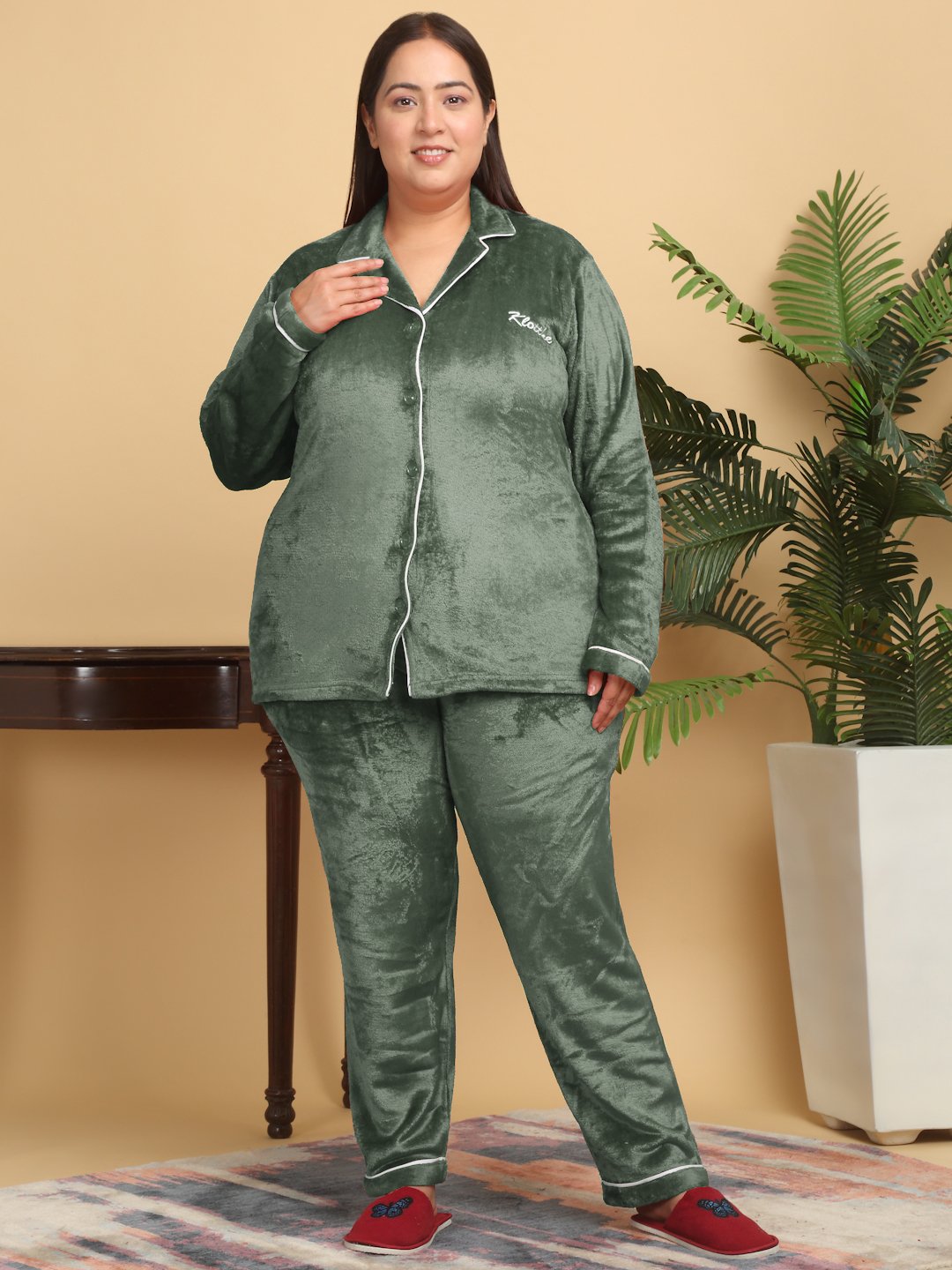 Women Green Solid Plus Size Woolen Night Suit